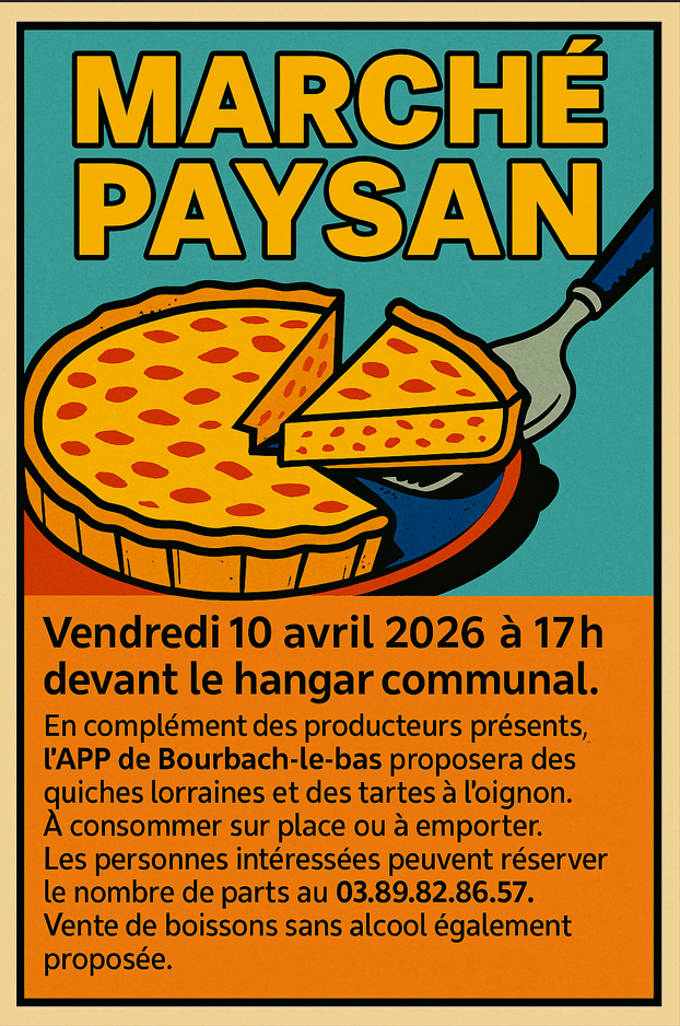Fil d'infos Marché paysan 10/04/2026 7 avril 2026/par mairie https://bourbach-le-bas.fr/wp-content/uploads/2026/04/Marche-paysan-10_04_26.png 938 622 mairie https://bourbach-le-bas.fr/wp-content/uploads/2019/07/logo.png mairie2026-04-07 06:12:392026-04-07 06:13:42Marché paysan 10/04/2026